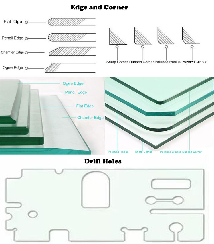 Обработка, такая как полированные края, просверленные отверстия, вырезы, защитные углы, а также печать логотипов и узоров.