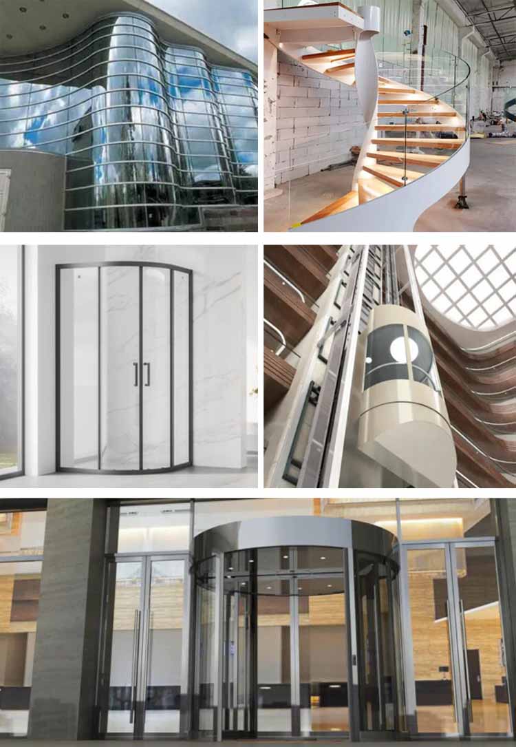 Гнутое закаленное стекло в основном используется в изогнутых стеклянных навесных стенах, потолках освещения, туристических лифтах, внутренних перегородках, внутренней отделке, мебели и т. д.