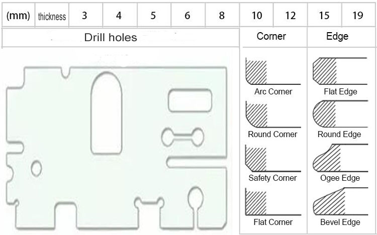 Обработка, такая как полированные края, просверленные отверстия, вырезы, защитные углы, а также печать логотипов и узоров.